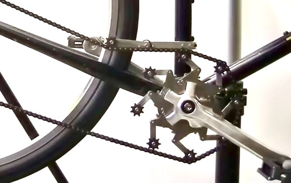 フロントチェーンリングは通常のギヤ=歯車形状では無い。小さな8つのプーリーとそれを支えるアーム、トルクに応じてアームを伸縮=回転半径を変えるバネから構成されている。