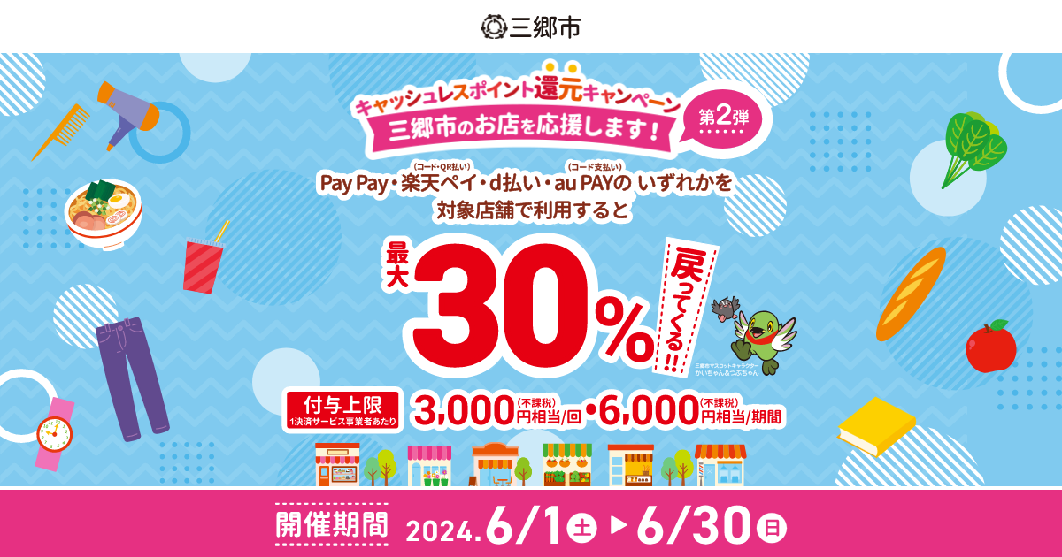 6月1日より30日までの期間中に三郷市内の対象店舗でPayPay、楽天ペイ、d払い、au PAYで支払いをすると、最大30%ポイント還元の三郷市キャッシュレスポイント還元キャンペーン第2弾が行われます。