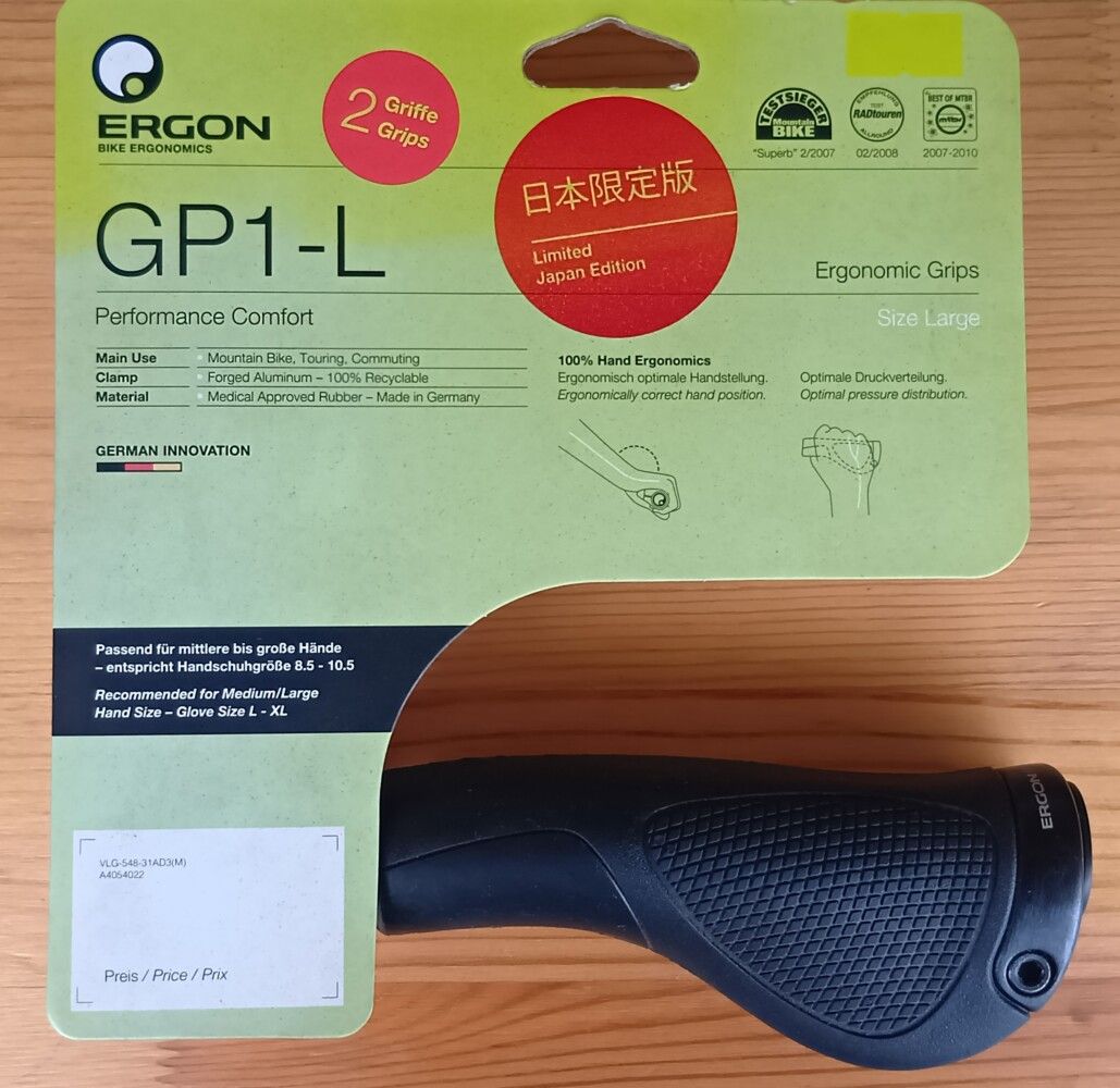 MTBのグリップが劣化(摩耗と夏の暑さでベトベトし始めた)ので、ERGON GP1-Lエルゴグリップに交換しました。