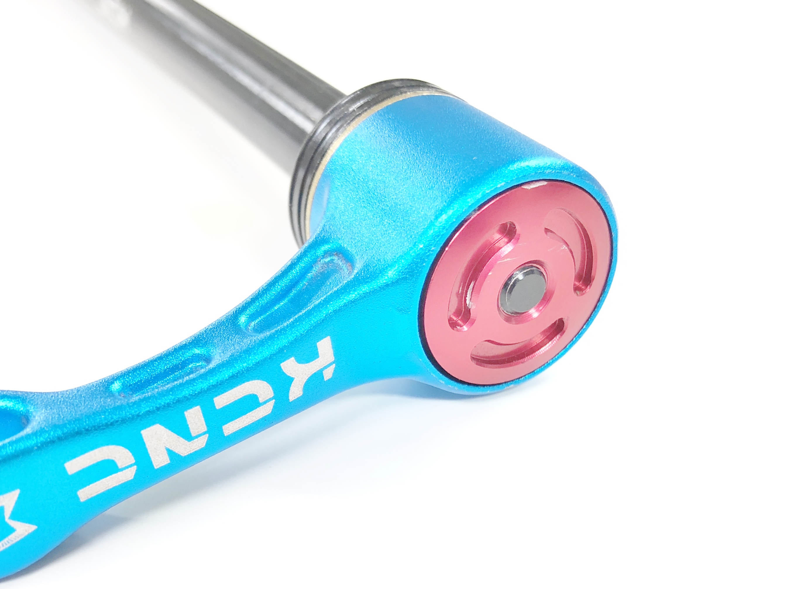 スルーアクスルをKCNCクイック&イージースルーアクスルに交換した。カラーはブルー。