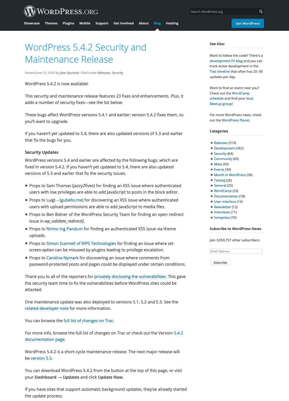WordPress 5.4.2がリリースされました。このリリースは、セキュリティとバグ修正を組み合わせたアップデートのため、できるだけ早くアップデートすることをお勧めします
