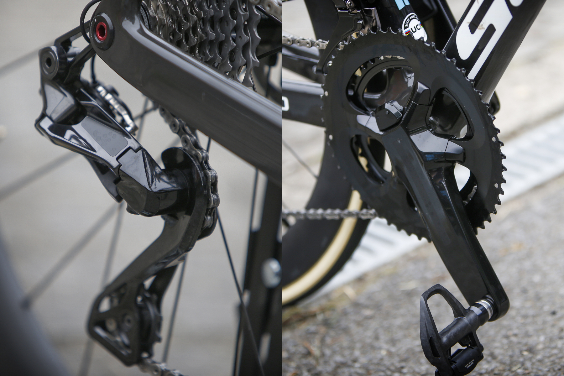 噂通りの12速、リアディレーラーとフロントディレーラーは有線接続。そしてクランクは左右パワーメーター内蔵。